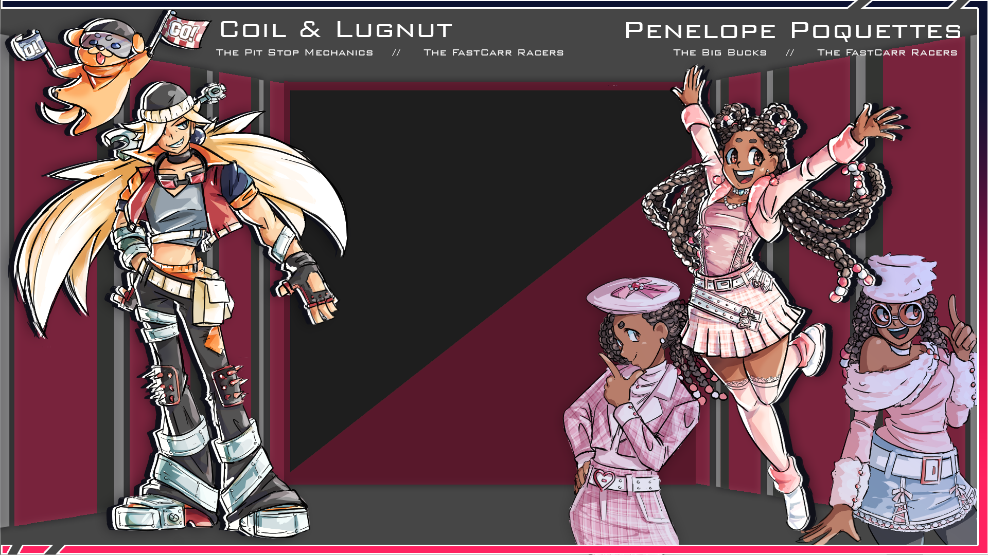 The FastCarr Racers are characters I designed for a hypothetical racing game following the young hotheaded Jesse Jetstream, an aspiring racer who loves all things extreme as he chases his dreams of being able to stand in the Winner's Circle alongside his idol, the undefeated, the stylish, the world renowned Mirage Ishikari. With the help of the financial investments of the incredibly wealthy Poquettes family and his best friend/pitstop mechanic Coil and his right-hand-flying-puppy Lugnut, Jesse's race from the bottom to the top of the league is on! This piece was selected as a finalist for the JoyArt 2025 art competition in Boston and won the People's Choice Award.